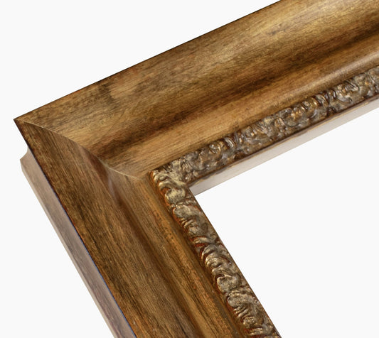The most beautiful exclusive frame is made of real wood with a nice plaster background and is covered with hand-made metal sheets and has a very warm brown patina.