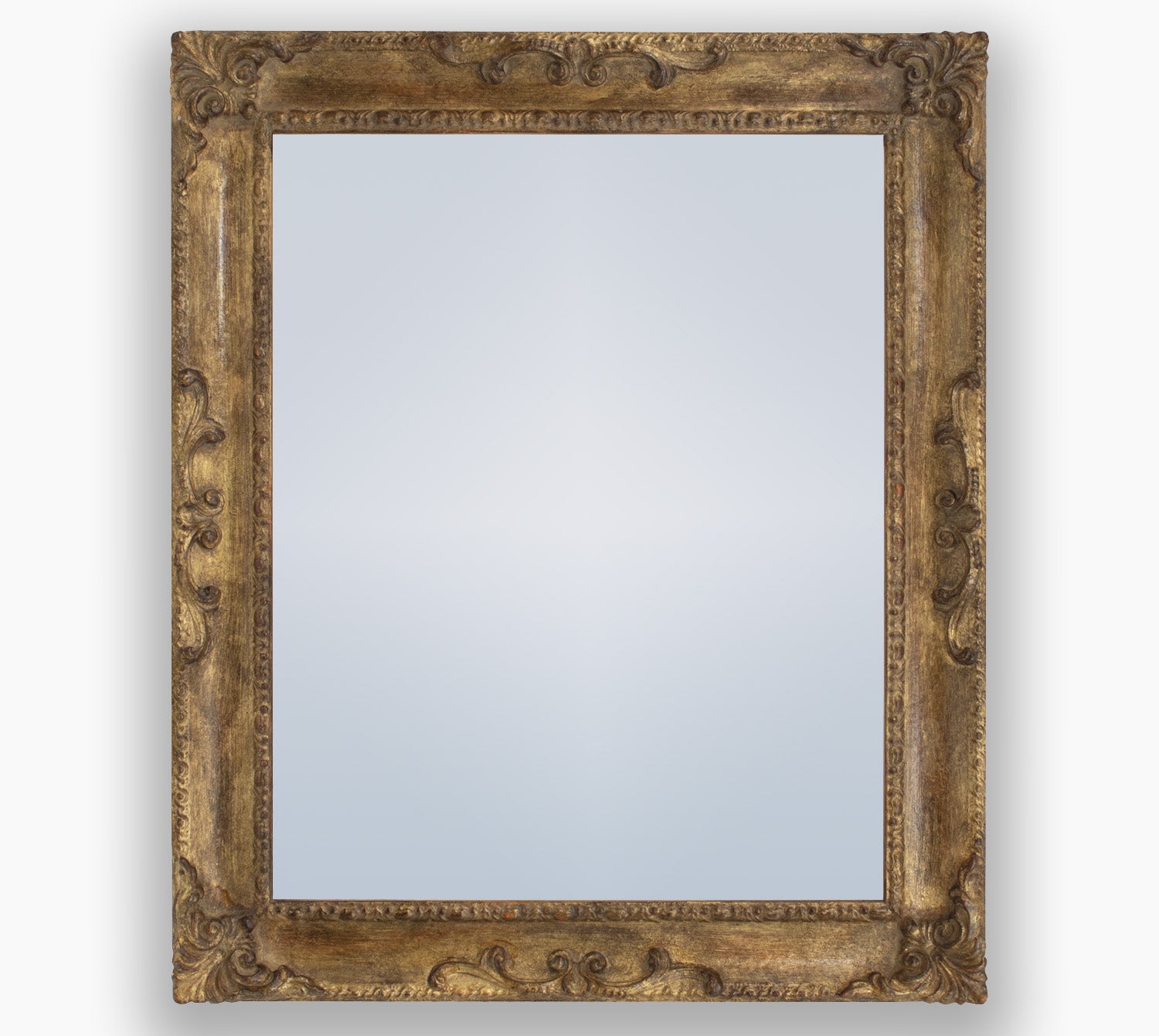 Espejo con marco dorado y acabado en madera patinada antigua, ideal para realzar cualquier interior y para insertar un objeto valioso en un mueble.