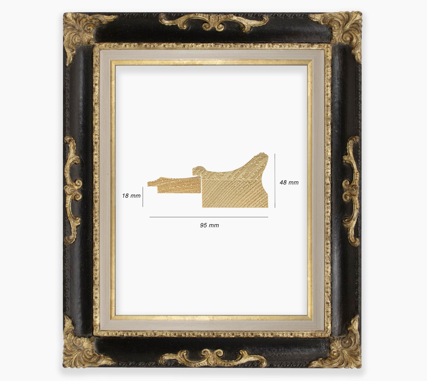 Black baroque frame with gold leaf and a Marie-Louise motif. Finely handcrafted, this frame is perfect for framing your work to showcase. This frame is suitable for framing antique and classic paintings, and can also be used to create beautiful mirrors.